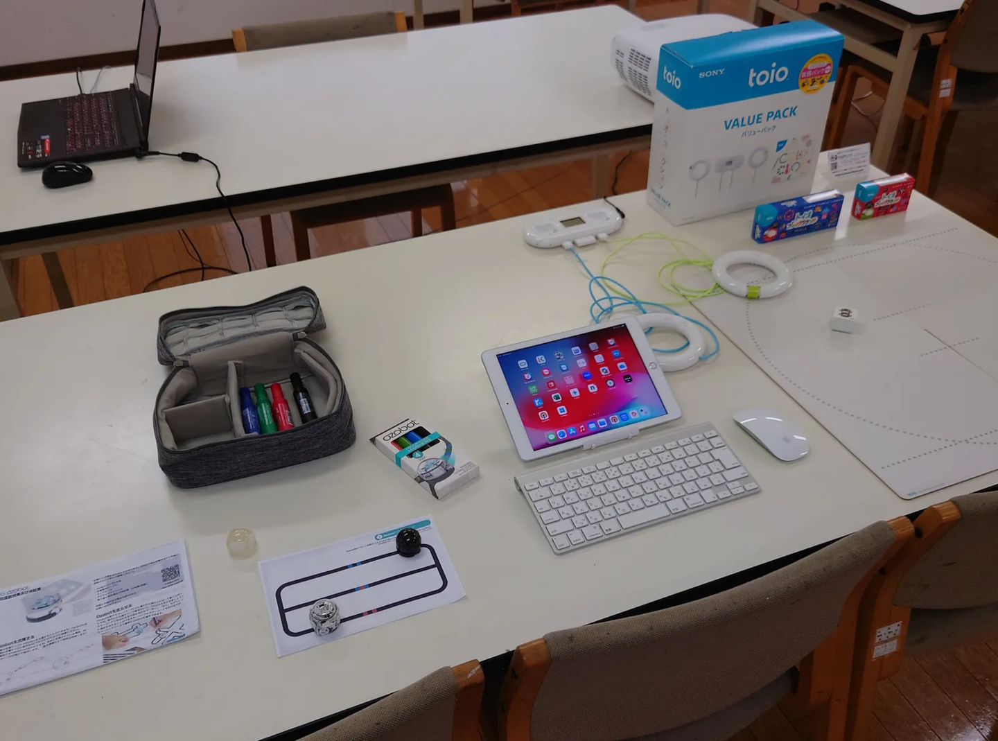 ※教材は、各テーブル1セット(toio 2台、Raspberry Pi 1台)。参加者が少ない場合追加で教材を使用できますが、追加分として4,400円(2テーブル扱い合計8,800円)をいただきます。